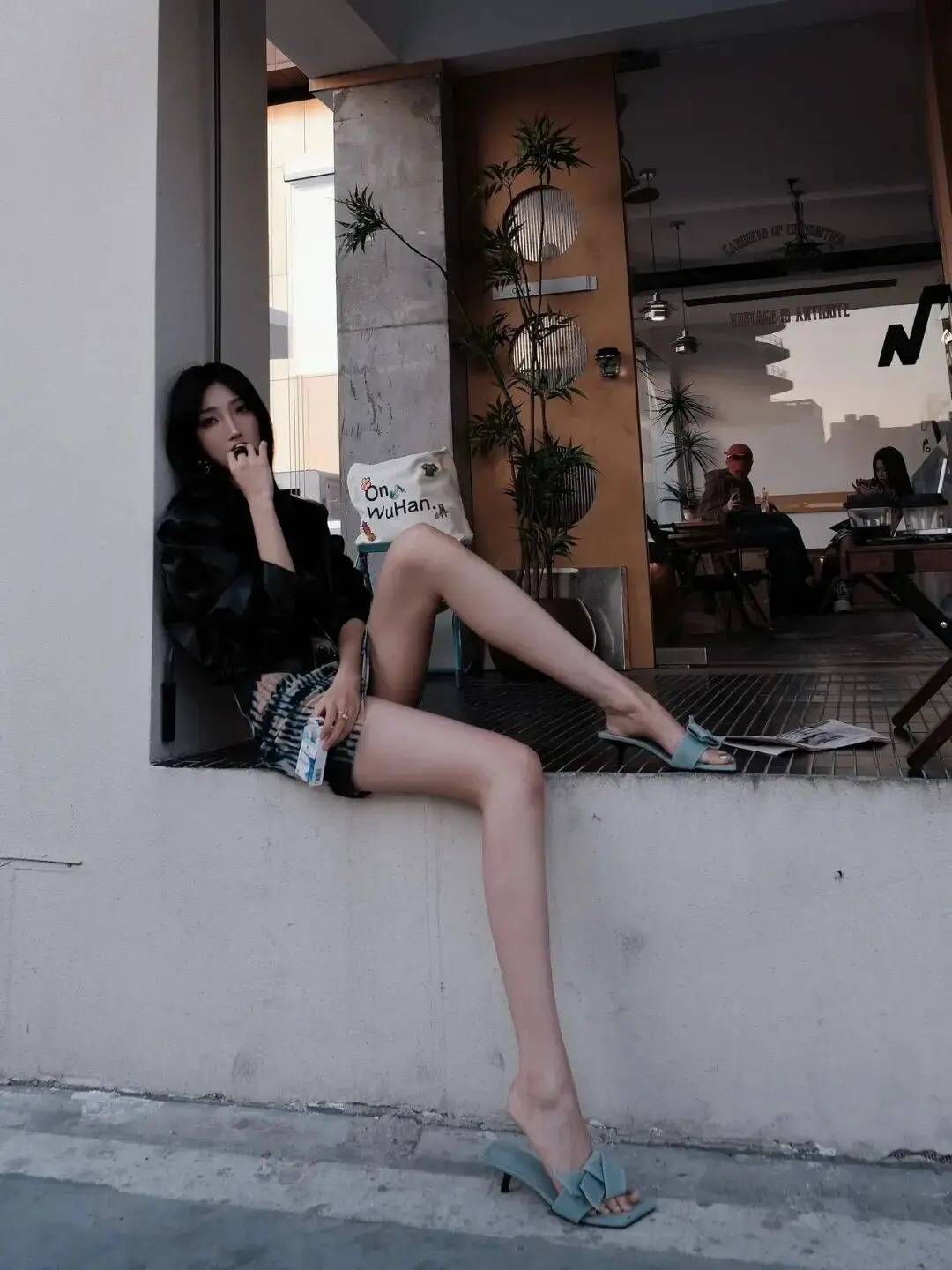 人物倚墙落座,借墙面支撑让身体放松,一腿自然伸展、一腿微屈叠放,既衬出腿部线条又不显刻意。单手轻抵唇畔带点慵懒小情绪,另一只手握着小物件增加生活感,不用硬凹角度,顺着环境松弛摆态,轻松拿捏随性又有氛围的街拍腔调