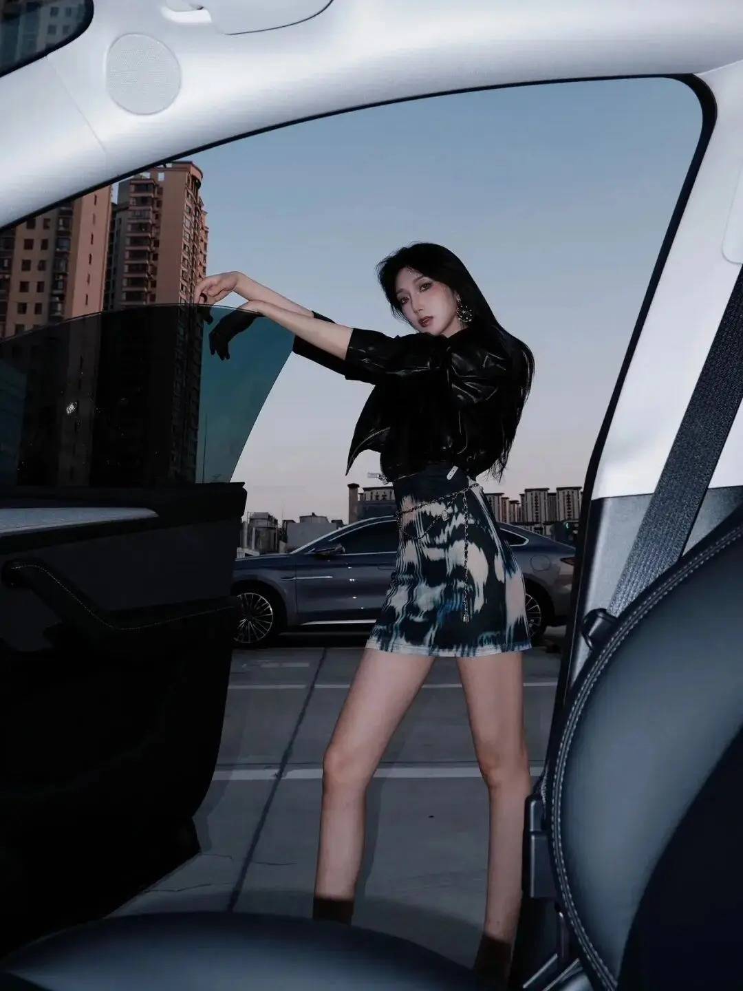 人物借车门做场景互动,双臂舒展轻搭车窗,既拉开展现肢体张力,又衬出随性气场。双腿自然错开站立,一腿微屈消解僵硬感,不用刻意摆造型,顺着环境的都市调性放松姿态,慵懒中裹着利落范儿,轻松拍出自带故事感的街头氛围感